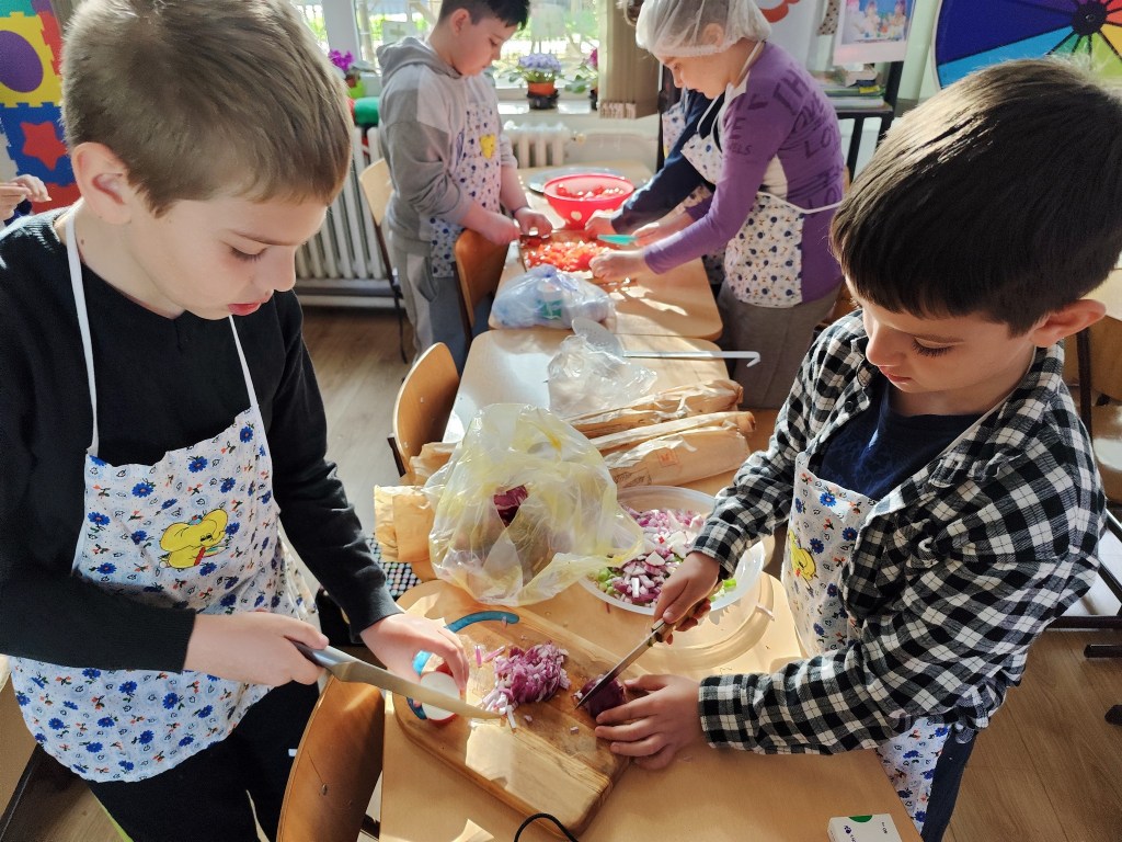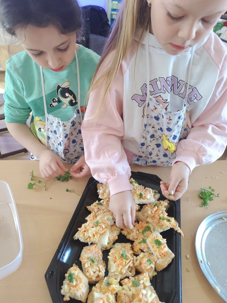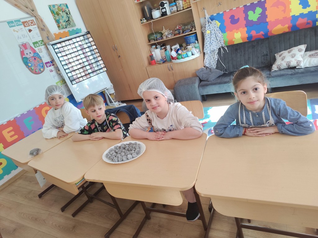 - prepararea pe echipe a două rețete ca aperitiv și a două rețete ca desert; pregătirea activității a început de ieri cu împărțirea pe echipe, împărțirea responsabilităților, lista de ingrediente și ustensile necesare; respectarea etapelor de lucru pentru fiecare preparat, organizarea echipei, realizarea produsului final și curățenia la masa de lucru au fost punctate, stabilindu-se o echipă câștigătoare; toate au fost pe podium, fiecare învățând câte ceva din minusurile celorlalte echipe; toate preparatele au fost savurate de cei mai mulți cu o mare poftă și bucurie, apreciind munca colegilor