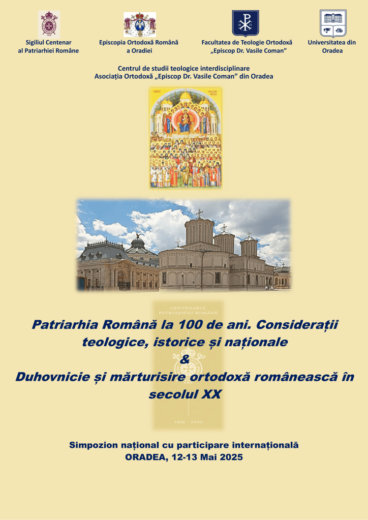 Cu binecuvântarea Preasfințitului Sofronie, Episcopul Oradiei, Facultatea de Teologie Ortodoxă Episcop Dr. Vasile Coman din cadrul Universității din Oradea organizează în zilele de 12 și 13 mai 2025, Simpozionul național cu participare internațională cu tema: Patriarhia Română la 100 de ani. Considerații teologice, istorice și naționale & Duhovnicie și mărturisire ortodoxă românească în secolul XX.