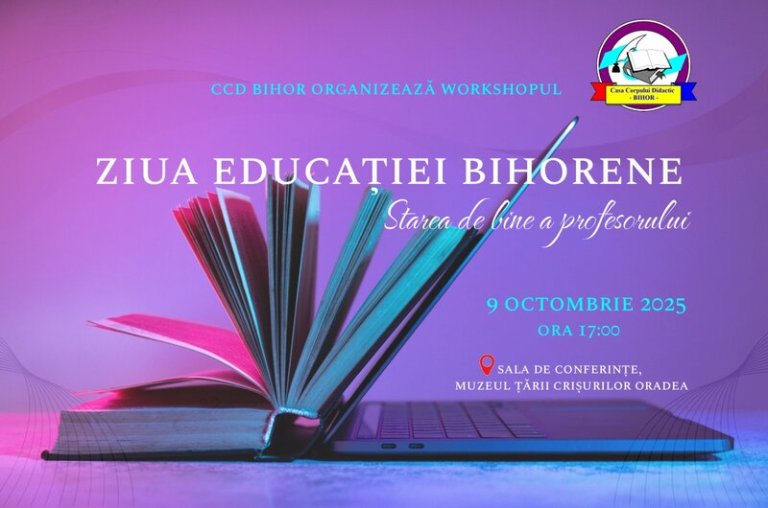 „Vă invităm să participați la workshop-ul dedicat Zilei Educației, care se sărbătorește anual la nivel internațional, precizează directorul CCD Bihor, prof. Cristian Bugle. De această dată, o vom sărbători pe 9 octombrie 2025, de la ora 17, la Muzeul Țării Crișurilor, sala de conferințe. Prezența dumneavoastră ne onorează”.