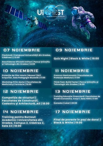 „Deschiderea festivalului este marcată de un flash mob plin de energie, organizat în fața clădirii E a Universității din Oradea, unde studenții și asociațiile studențești sunt așteptați să dea tonul unei perioade vibrante, pline de zâmbete și voie bună”, spune Ioana Iova, vicepreședintele USR pe zona de vest și coordonator zonal al Festivalului UniFest.