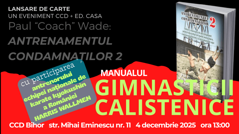 CCD Bihor, în parteneriat cu Editura Casa, organizează pe 4 decembrie 2025, ora 13:00, la sediul din strada Mihai Eminescu nr. 11, un eveniment special dedicat lansării volumului al doilea al lucrării Antrenamentul condamnaților. Cartea este semnată de Paul “Coach” Wade, cunoscut autor în domeniul antrenamentului cu greutatea corporală, care și-a construit reputația pe tehnici de fitness dezvoltate în condiții extreme și adaptate pentru orice nivel de pregătire.