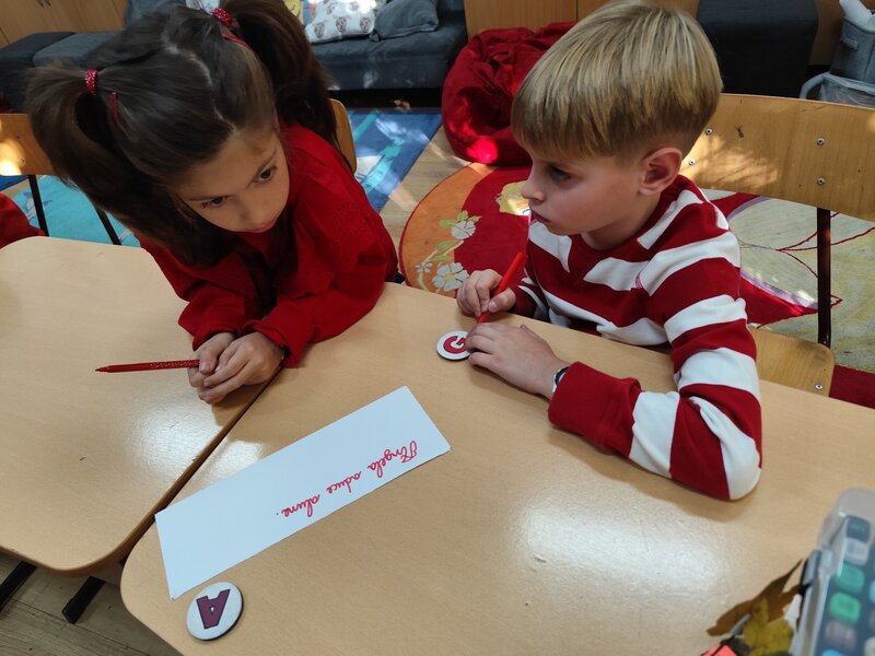 - muncă în perechi (scrierea cu roșu a unor propoziții in care fiecare cuvânt incepe cu litera jetonului extras)