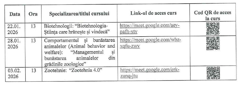 Cursurile vor avea loc pe platforma Google Meet: 22 ianuarie 2026, de la ora 13, LINK DE ACCES; 28 ianuarie 2026, ora 13, LINK DE ACCES; 3 februarie 2026, ora 13, LINK DE ACCES.