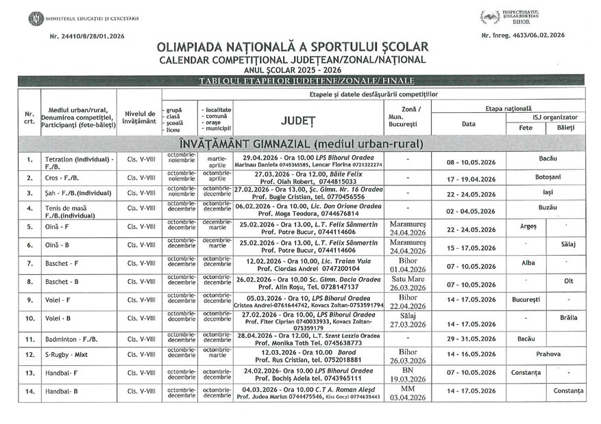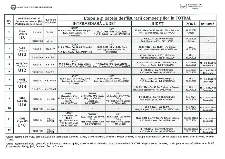 - La învățământul gimnazial, ramura sportivă fotbal – B., pentru etapa județeană, se califică echipele clasate pe locul I și II din cele două grupe intermediare: nord, respectiv sud. Grupa intermediară NORD este alcătuită din sectoarele: Marghita, Aleșd, Valea lui Mihai, Oradea și sector Oradea, iar Grupa intermediară SUD din sectoarele: Beiuș, Ștei, Salonta, Oradea și Tinca