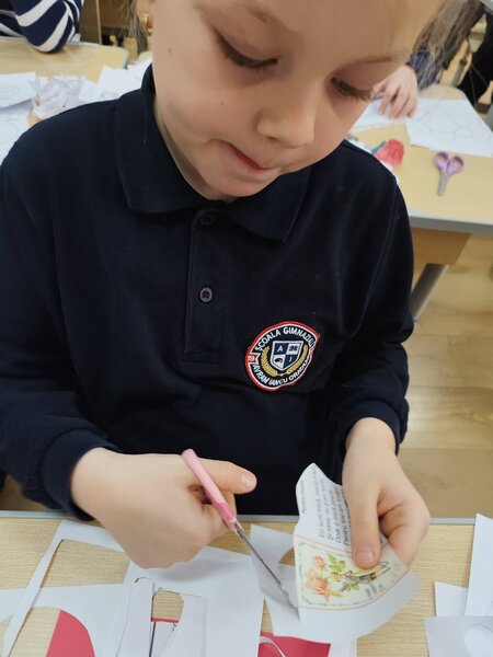 Șabloanele utilizate au avut forme variate – inimioare, flori, fluturași, plicuri sau mini-cărțulii – fiecare element fiind atent decupat, colorat și lipit. Copiii au dat dovadă de responsabilitate și seriozitate, completând informațiile cu grijă și interes, dorind ca darul lor să fie perfect.