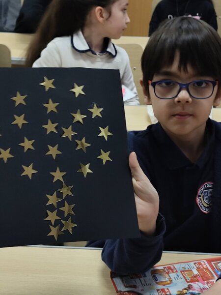 A urmat partea creativă: fiecare elev și-a lipit steluțele pe o coală albastră, asemenea cerului nopții; le-a unit după propria imaginație; și-a creat propria constelație, oferindu-i un nume simbolic.