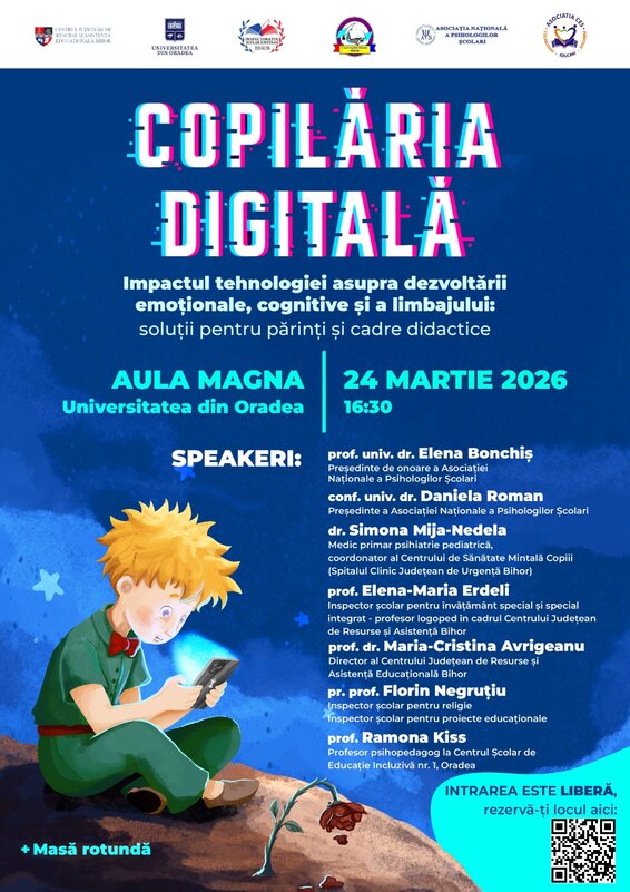 Evenimentul va avea loc în data de 24 martie 2026, de la ora 16:30, în Aula Magna a Universității din Oradea, reunind specialiști din domeniul psihologiei, sănătății mintale și educației. Conferința se adresează în mod special părinților și cadrelor didactice.