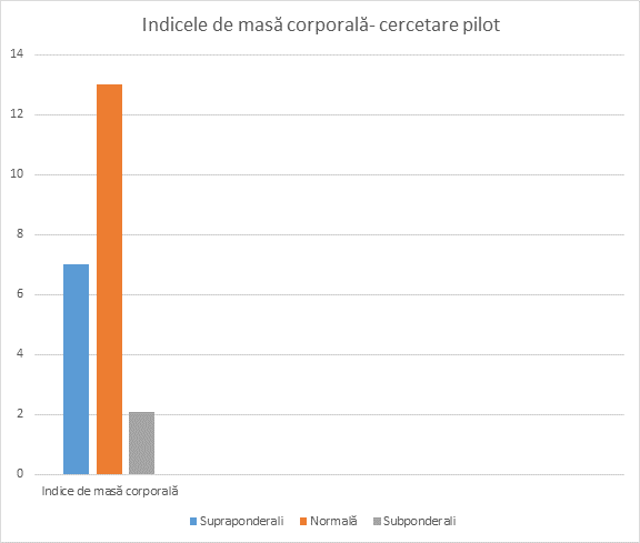 - Indicele de masă corporală; formula pentru indicele de masă corporală folosită a fost cea pentru adulți, datorită faptului că nu am găsit o formulă unitară pentru copii, dar totuși ne dă o idee aproximativă despre masa corporală normală pe care ar trebui să o aibă un copil la această vârstă;