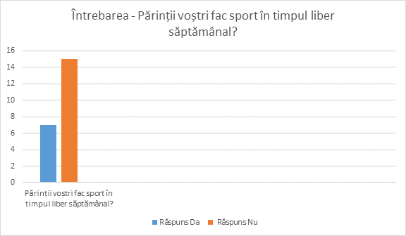 La întrebarea „Părinții voștri fac sport în timpul liber săptămânal?”, au răspuns cu DA, doar 34% din elevi, restul au răspuns cu NU. (grafic nr. 5)