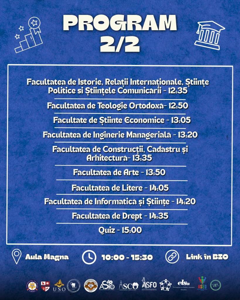 Ceremonia de deschidere va avea loc în Aula Magna, începând cu ora 10:00. Ulterior, studenții vor susține o serie de prezentări, pentru fiecare dintre cele 15 facultăți ale Universității din Oradea. „Scopul acestor prezentări este acela de a le oferi elevilor o perspectivă clară asupra parcursului academic, de la criteriile de admitere și structura programelor de studiu, până la oportunitățile